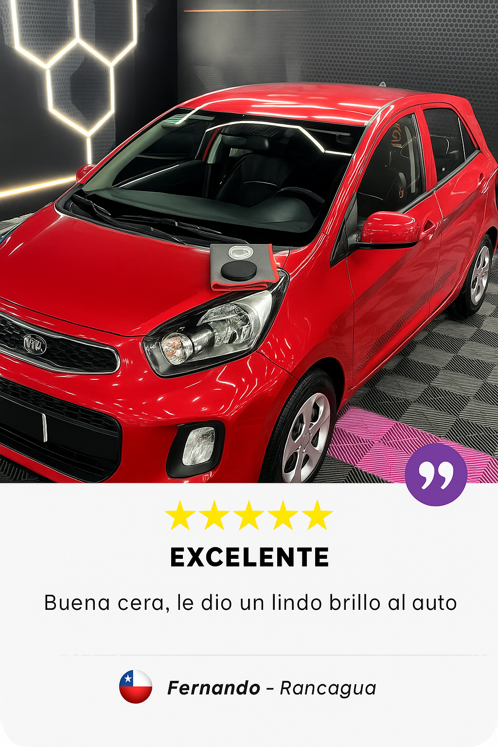 En solo segundos, esta cera profesional de carnauba 100 % pura se funde sobre la pintura y camufla cualquier raya, creando un escudo cerámico con brillo espejo y protección UV. Su fórmula ultra-hidrofóbica repele el agua y evita marcas, mientras realza el color de tu auto con un acabado tan pulido que parecerá recién salido del concesionario.